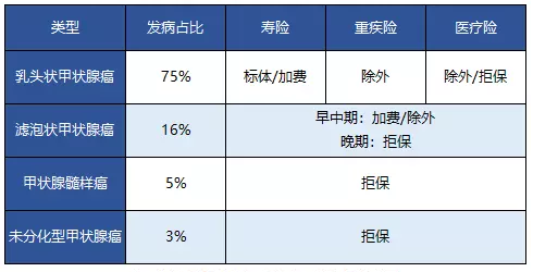 我們可以看到,對于乳頭狀甲狀腺癌最常見的病史,一些公司的重大疾病保險(xiǎn)和醫(yī)療保險(xiǎn)可以排除甲狀腺癌承保,壽險(xiǎn)甚至可以標(biāo)準(zhǔn)體承保。