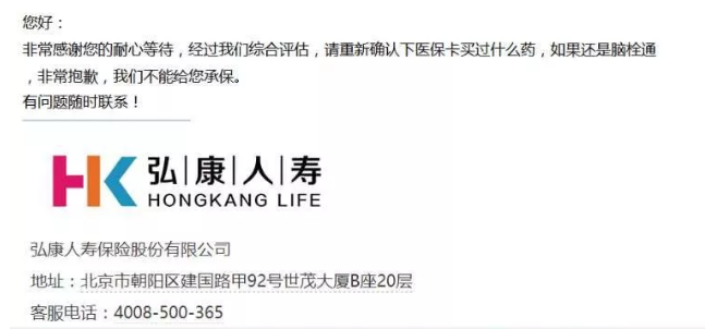 多保魚(yú)建議他向弘康人壽提交補(bǔ)充告知,保險(xiǎn)公司返回結(jié)果是:如果確認(rèn)是腦栓通,將拒絕承保。