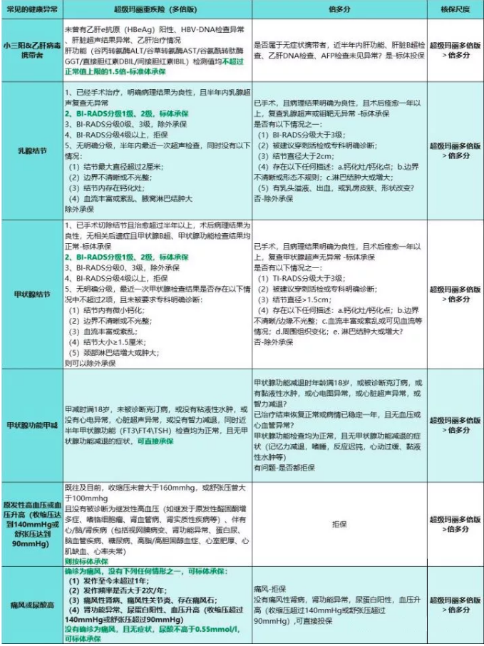 明顯看到,超級瑪麗多倍版的健告告知在這幾項上更寬松,標準體承保的幾率更大。