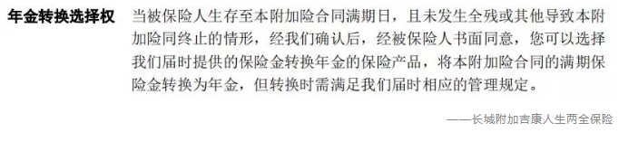 2)合同到期的情況下,將合同的保險金轉(zhuǎn)換成年金產(chǎn)品,也就是把一次性領(lǐng)取的滿期金換成每年領(lǐng)取的年金。