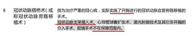 條款中只保障冠狀動脈搭橋手術(shù),并且注明:冠狀動脈支架手術(shù)不在保障范圍。