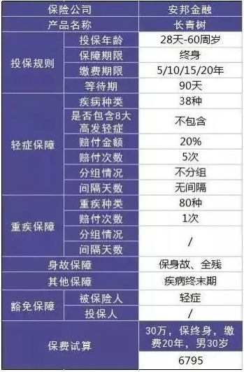 長青樹重疾保障的種類有80種,賠付一次,保障的輕癥有38種,不分組,能賠付5次,每次賠付基本保額的20%,每次賠付沒有間隔期,8大高發(fā)輕癥中缺少了不典型急性心肌梗塞。