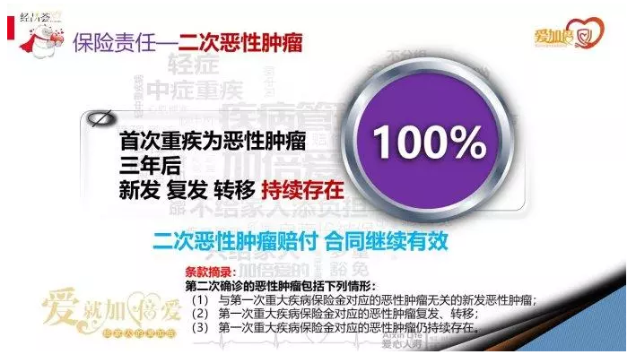 但是,經過惡性腫瘤的治療后,有些人會發(fā)生轉移和復發(fā),其中大部分發(fā)生在根治性手術后80年內,約占80%;并且愛心人壽的愛加倍第一次惡性腫瘤和第二次惡性腫瘤的間隔時間僅為3年,包括新發(fā)惡性腫瘤、復發(fā)、轉移和持續(xù)性癌癥,這大大增加了賠付的幾率,真是一款很有誠意的保險!