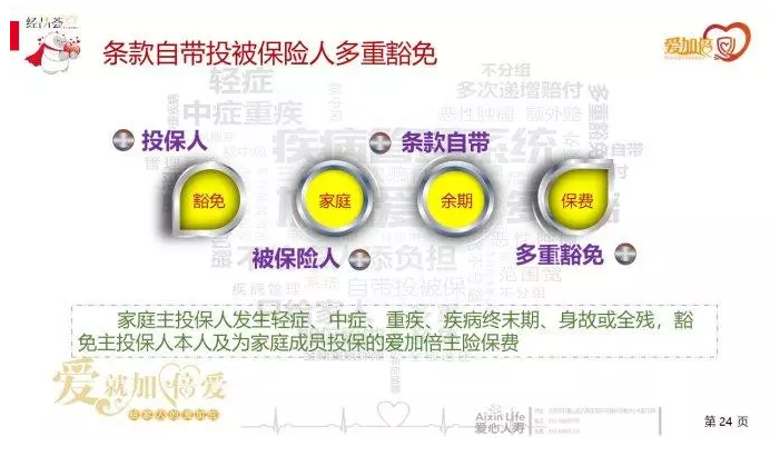 愛加倍是被保險人輕癥豁免、 中癥豁免、重疾豁免、死亡或完全殘疾豁免、疾病結束期豁免;這應該是市面上首款自帶投保人豁免費用的重疾產品;在夫妻互保中,例如,40歲,購買50萬其他產品,被保險人的費用為豁免約1000元,而在愛加倍中,這筆費用免除,真真的是客戶的大福利呢,愛加倍果真加倍愛!