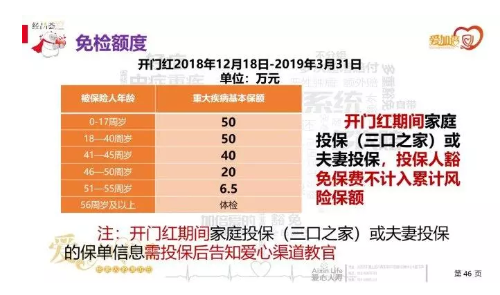 在產品開放期間,被保險人的豁免的保費不包括在保額的累積風險中。例如,丈夫和妻子都是35歲。根據規(guī)定,醫(yī)療豁免金額為500,000。即使被保險人是豁免,你仍然可以購買50萬保額的;