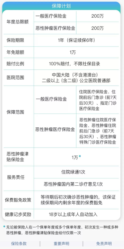 條款規(guī)定,在保險期間,若罹患有惡性腫瘤,額外獲得1萬元津貼。這相當于癌癥醫(yī)療0免費補償。但是,這10,000份津貼只能收取一次,相當于只有一次機會抵消免賠額。