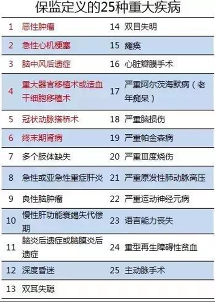 2007年,中國(guó)頒布并實(shí)施了由中國(guó)保險(xiǎn)行業(yè)協(xié)會(huì)和中國(guó)醫(yī)師協(xié)會(huì)聯(lián)合開(kāi)發(fā)的《重大疾病保險(xiǎn)的疾病定義使用規(guī)范》。任何保險(xiǎn)公司的重大疾病產(chǎn)品必須涵蓋標(biāo)準(zhǔn)、疾病狀態(tài)或手術(shù)的疾病范圍。