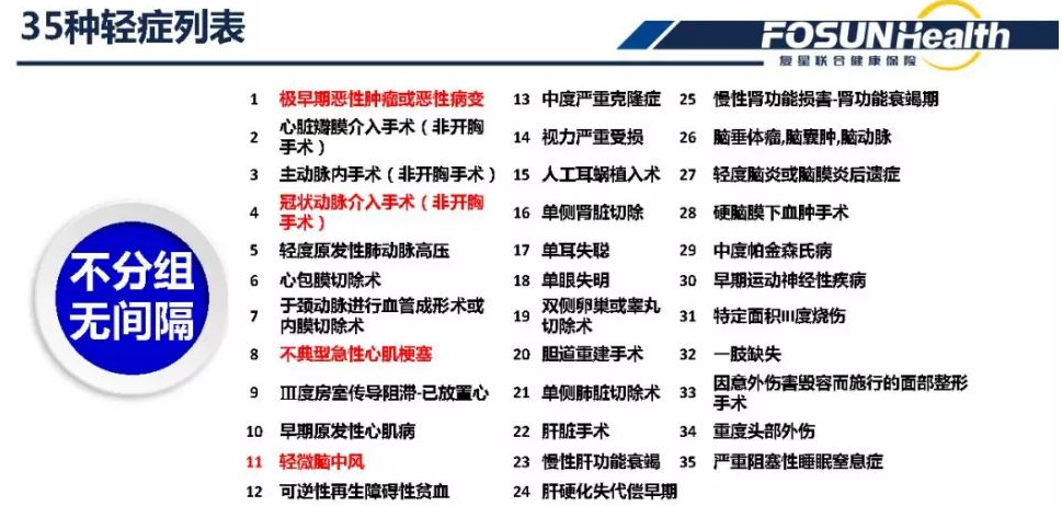1、復(fù)星組合小保倍35種輕癥疾病包含輕癥,對應(yīng)于大多數(shù)高風(fēng)險(xiǎn)或相對高風(fēng)險(xiǎn)的輕疾。這確實(shí)更好。當(dāng)然,我們必須知道所謂的輕癥也是一種非常嚴(yán)重的疾病,而不是日常小病。