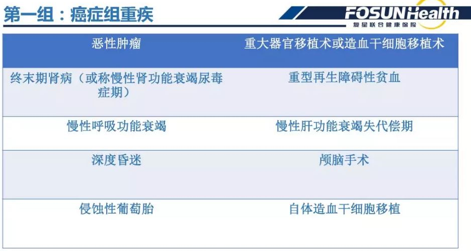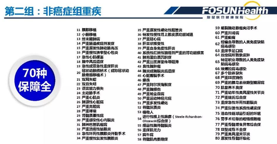80種疾病分為2組。第一組10種疾病,包括惡性腫瘤、主要器官移植或造血干細(xì)胞移植、終末期腎病三大高危重大疾病;第二組70種疾病包括急性心肌梗死、腦中風(fēng)后遺癥、冠狀動脈搭橋術(shù)3種高發(fā)疾病。