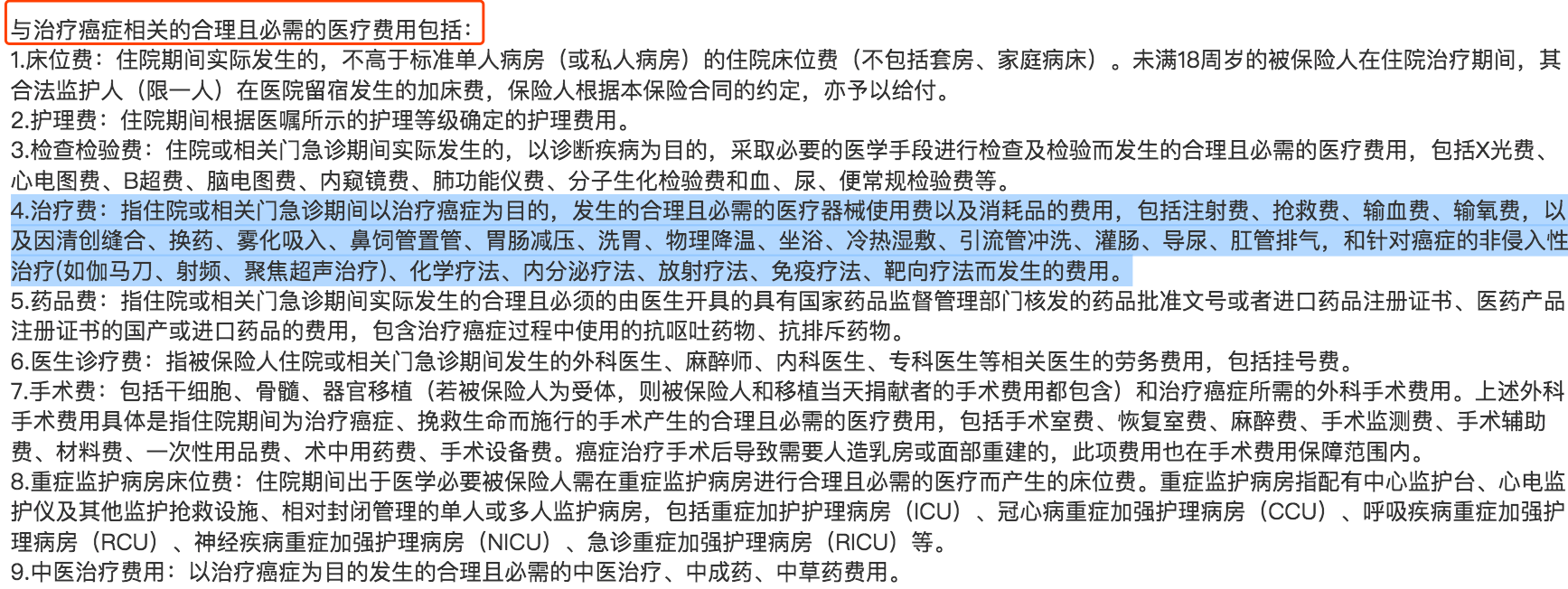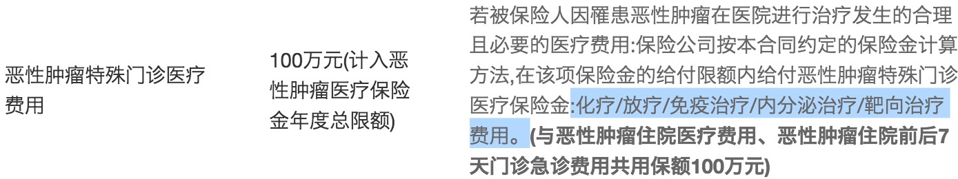 2保險(xiǎn)責(zé)任包括惡性腫瘤的特殊門(mén)診醫(yī)療費(fèi)用,包括化療,放射治療,免疫治療,內(nèi)分泌治療,靶向治療等。如慢粒慢性粒細(xì)胞白血病是不需要住院的,但需要長(zhǎng)期服藥維持,有針對(duì)性的治療。