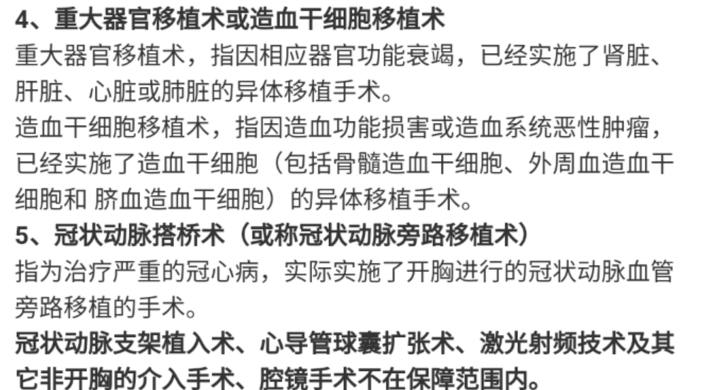 明確要求實施約定的手術并達到賠付狀態(tài)。常見的是重大器官移植,如肝臟、心臟、腎臟之類;或老年人冠狀動搭橋手術。