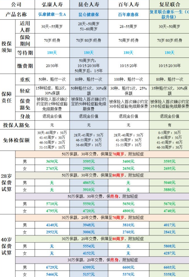 2、從保障責(zé)任的角度來看,嚴(yán)重的情況只能支付一次,弘康、昆侖、復(fù)星聯(lián)合的輕癥可以多次支付,如果你更看中賠付次數(shù),你可以選擇這些;另外弘康、昆侖、百年的輕癥可以選擇是否附加,復(fù)星聯(lián)合默認(rèn)自帶輕癥,如果你只注意嚴(yán)重的情況你可以選擇弘康、昆侖、百年的產(chǎn)品;在合同有效期內(nèi),退保(不建議)或死亡可以退還現(xiàn)金價(jià)值(罕見);四個(gè)產(chǎn)品輕癥可以是豁免后面的保險(xiǎn)費(fèi)用。