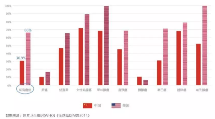 醫(yī)學(xué)上,5年生存概率通常用于衡量癌癥治療的效果。對于大多數(shù)癌癥治療,美國優(yōu)于中國。