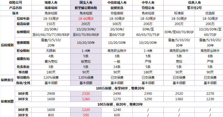 4.上面的對(duì)比顯示,國(guó)寶人壽愛至臻定期壽險(xiǎn)是一個(gè)非常好的定期壽險(xiǎn),無論是保障范圍,還是保險(xiǎn)費(fèi)率,無疑都是十分出眾的,非常建議購(gòu)買。