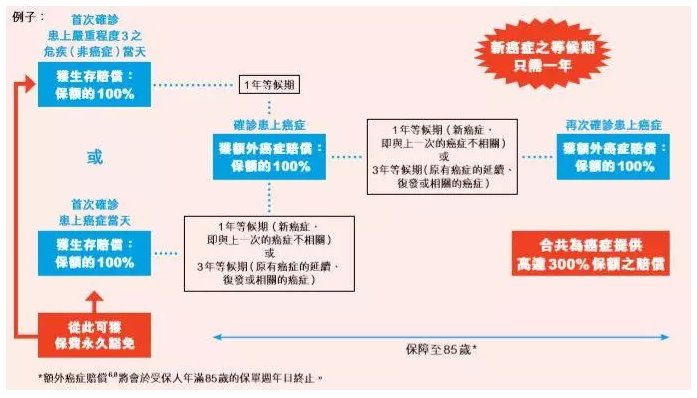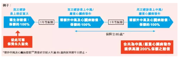 就首次因嚴(yán)重程度2或3之危疾已付或應(yīng)付生存賠償后,第一次從診斷日期開(kāi)始的基本計(jì)劃的保費(fèi)將永久為豁免,并且被保險(xiǎn)人可以免費(fèi)享受保障至保單終止。