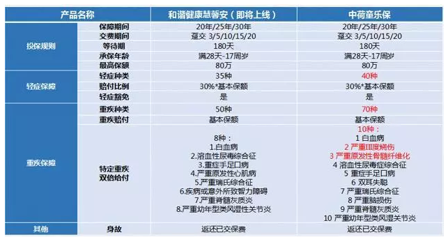 1.我們可以看出這兩個產(chǎn)品都在保障責(zé)任結(jié)構(gòu)和基本信息如支付期,等待期,保障期等都是一樣的,中荷童樂保重疾種類 70例,輕癥40種,特定疾病10種都多過慧馨安。