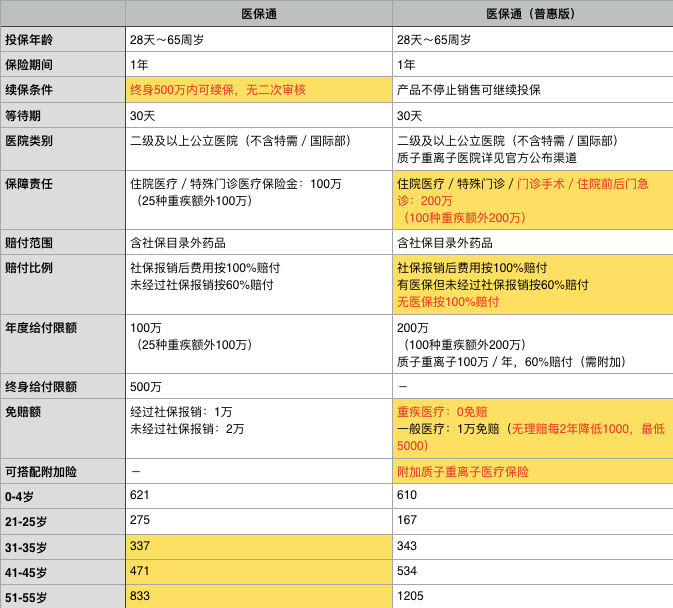 那么醫(yī)保通普惠版和醫(yī)保通有什么區(qū)別?更好嗎?還是不如上一版那樣,我編寫了一張表。有優(yōu)勢的項目標(biāo)有黃色。項目內(nèi)的優(yōu)化責(zé)任標(biāo)記為紅色,并且截取了幾個年齡組的費率,這更直觀。