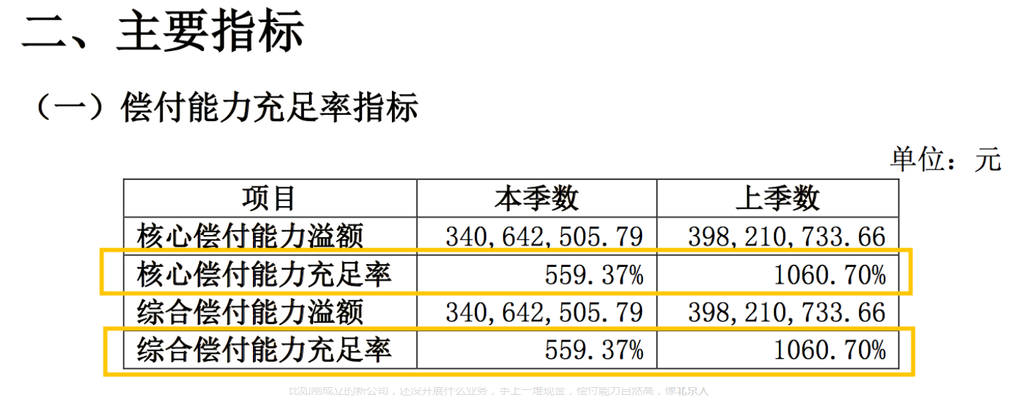 要求核心償付能力充足率達到標準,標準為50%;綜合償付能力充足率達標,標準為100%;綜合風險等級達標,標準為B或以上;任何不符合目標的公司都是償付能力不符合標準的公司。
