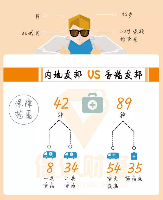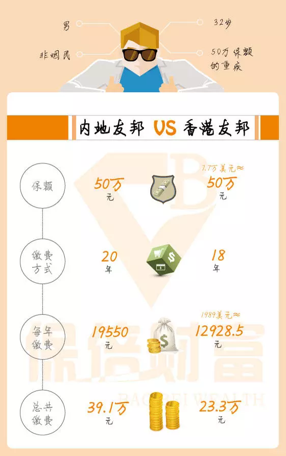 例如,被保險(xiǎn)人是一名32歲的非吸煙男子,他想要支付50萬(wàn)保額的嚴(yán)重疾病。他對(duì)友邦非常有信心并且最初準(zhǔn)備在內(nèi)地投保,但是一位朋友告訴他購(gòu)買(mǎi)香港保險(xiǎn)。便宜! 香港友邦相同的保額,保障更高,保費(fèi)更低。