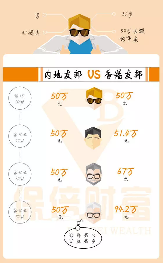 保單第50年,大陸保單價(jià)值500,000,香港保單價(jià)值942,000。