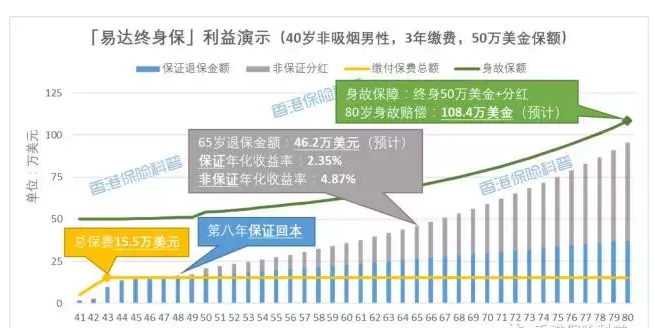 讓我們舉一個(gè)例子來看看「易達(dá)終身?!谷绾翁峁┮粋€(gè)帶有保單的“身故保障 +養(yǎng)老儲蓄+財(cái)富繼承”三種功效的。以下是該計(jì)劃的好處的示范(例如,一名40歲的非吸煙男子,死亡保額為0萬美元,3年繳費(fèi),每年5175美元,以及總共保費(fèi),三年約155,000美元):