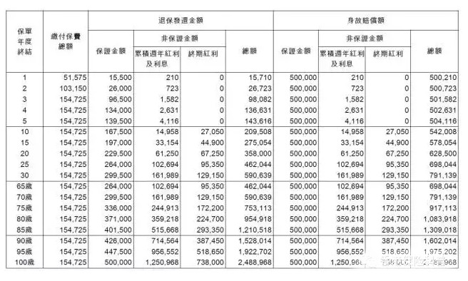 如果被保險(xiǎn)人選擇在65歲時(shí)退保,則預(yù)期的退保金額為462,000美元(約為總保費(fèi)的3倍),25年的年化收益率由此金額計(jì)算,保證年份為保單??傻帽蔚氖找媛蕿?.35%,非保證年化收益率為4.87%(功能2:養(yǎng)老儲蓄);