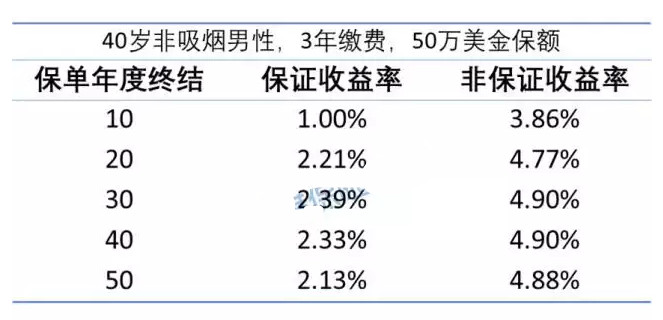 「易達(dá)終身?!固峁┑谋WC和非保證收益都很有吸引力。例如,一名40歲的非吸煙男子因?yàn)楸n~的死亡而被投保500,000美元,他有資格獲得每年保費(fèi)51575美元的三年付款。保證收益率和非保證收入在不同的保單年結(jié)束時(shí)可用。費(fèi)率如下: