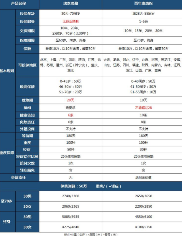 此外,瑞泰瑞盈有一個(gè)小優(yōu)勢,并且不需要被保險(xiǎn)人的BMI指數(shù)。例如,在百年康惠保中,被保險(xiǎn)人的BMI不得超過28。這意味著如果保險(xiǎn)指數(shù)不符合標(biāo)準(zhǔn),但身體沒有異常,則可能無法確保這一重大疾病保險(xiǎn),或做核保處理。但瑞盈顯然更友好。