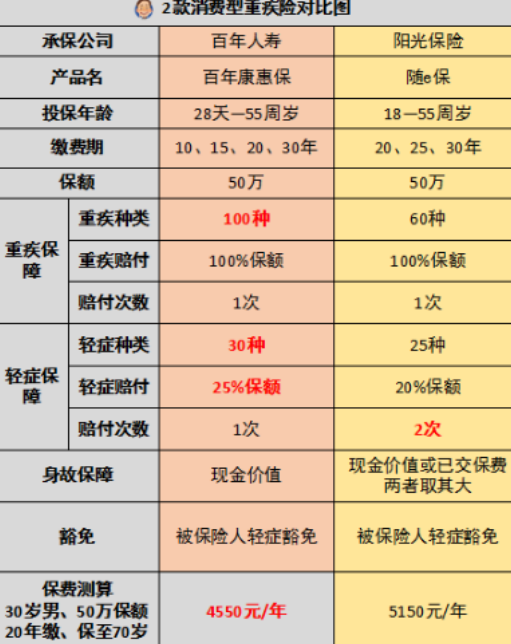 百年康惠保和陽光隨e保進(jìn)行了比較。圖中的紅色字符是它們各自的優(yōu)點(diǎn)。