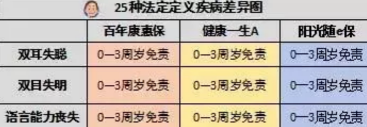 這三種產(chǎn)品在25種法定重疾理賠中具有相同的時間限制,例如“雙目失聰、雙耳失明、語言能力喪失”三種重疾所有都免于3歲以下。