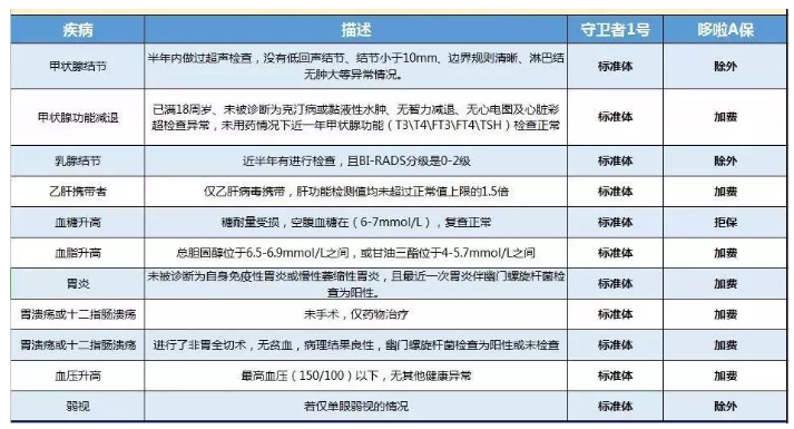 豁免保障 +智能核保 +預核保在豁免保障,守衛(wèi)者1號可選保險豁免,輕癥 / 中癥 / 重疾 /死亡/總殘疾,可以保護所有,說360°無死角。雖然,保障責任不包含中癥保障,但已經在保險豁免條款中達成一致,一旦遭遇20種中癥疾病,豁免后期保費。真棒!但是,應該注意的是,被保險人豁免暫時只對未成年人開放,也就是說,只有父母可以為孩子投保,如果他們想要互相保護,他們必須等待。讓我們來談談它的智能核保,守衛(wèi)者1號的智能核保相對寬松。如果身體有小問題,如甲狀腺結節(jié)、乳腺結節(jié)、乙型肝炎攜帶者,即使是輕微的三高人口也可以正常購買。