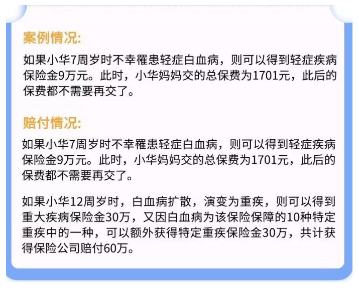 事實(shí)上,兒童的重大疾病保險還通過少量投資轉(zhuǎn)移了保險公司可能發(fā)生的風(fēng)險。一旦孩子患上嚴(yán)重疾病,只要確認(rèn)的疾病符合保險條款中的保障對象,保險公司就可以獲得一次。對應(yīng)的賠付保障。對于兒童,兒童的重大疾病保險的發(fā)展是非常合適的,保費(fèi)低,保障高。今天評估一個特殊的保障孩子健康成長的重大疾病保險—— 中荷童樂保少兒重疾險。