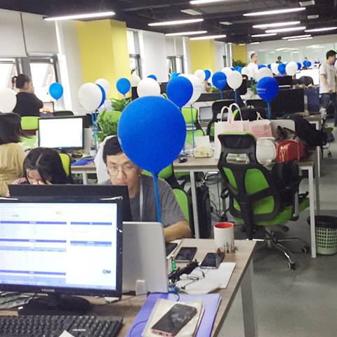 (公司整個工位上都放有藍白相間的氣球,遠遠望去就像一片藍藍的大海一樣,也希望多保魚這條小魚在互聯(lián)網(wǎng)金融的大海之上乘風(fēng)破浪,勇往直前。)