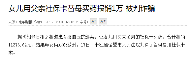這不是危言聳聽(tīng)。在2015年,就有新聞報(bào)道過(guò),浙江一女子因冒用父親社??ㄌ婺赣H買(mǎi)藥報(bào)銷(xiāo),與母親被雙雙判刑。