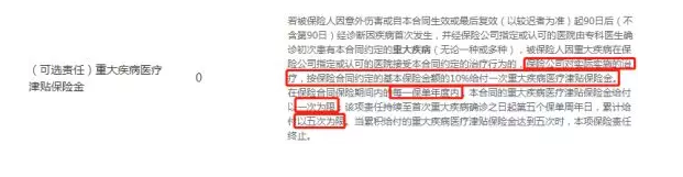 即:確診重疾后,在指定醫(yī)院治療的,每年給付一次額外10%基本保額的保險(xiǎn)金,持續(xù)至確診日后的第5個(gè)保單日,累計(jì)給付5次。