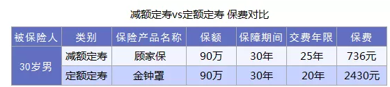 同樣的保額、保障期限和交費年限,顧家保每年保費為908元,金鐘罩的保費為2430元,后者保費翻了近2倍。