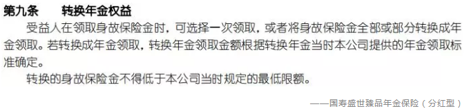 1)合同出險的情況下,所得的保險金額(身故保險金)不一次性領(lǐng)取,而是轉(zhuǎn)換成年金,每年固定領(lǐng)取。