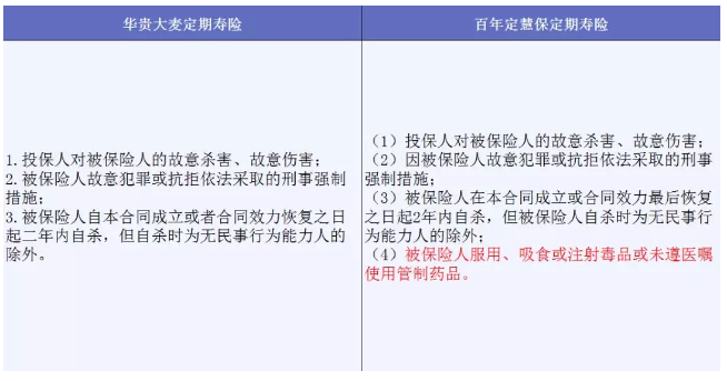 綜上,在責(zé)任免除方面,華貴大麥壽險要比百年定慧保壽險更有優(yōu)勢一些。