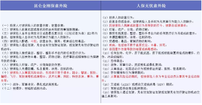 高風(fēng)險運動:人保無憂指明專業(yè)運動員或從事專業(yè)運動的除外,但沒有舉例一些常見的高風(fēng)險運動名稱。昆侖金剛列舉了十幾個高風(fēng)險運動,但沒有將專業(yè)運動員排除在外,這一點兩款產(chǎn)品不相上下。