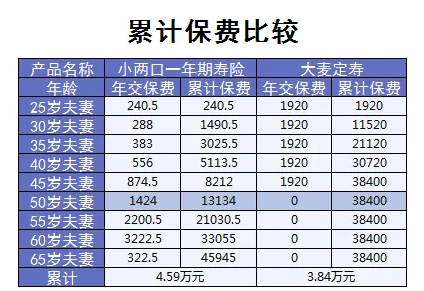 而小兩口如果每年續(xù)保,一直到65歲的話,總保費為4.59萬,比大麥貴了0.75萬。