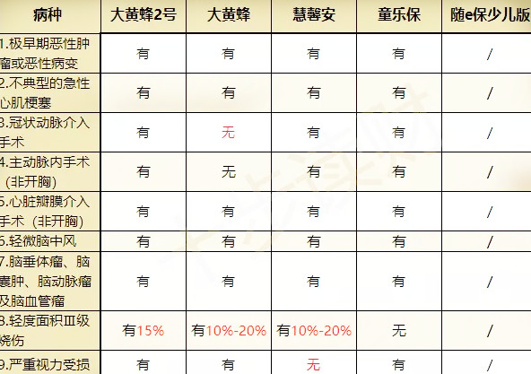 同樣,我們使用該表來比較5個產(chǎn)品中的高發(fā)布輕癥的保障范圍: