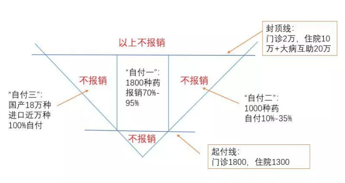 醫(yī)療險(xiǎn)大家都知道吧,今天咱們就來(lái)聊聊醫(yī)療保險(xiǎn)。大家比較熟悉的一個(gè)是一老一小,一個(gè)是新農(nóng)村合作社?;旧?,可以報(bào)銷醫(yī)院的一部分。如果您愿意交,國(guó)家就承保。并且報(bào)銷還是有起付線,封頂線,報(bào)銷比例。如下所示。