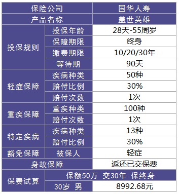 蓋世英雄是一款單次賠付保障終身的重疾險(xiǎn),重疾賠1次,輕癥賠1次,賠付基本保額的30%,男性特定疾病額外賠付30%??傮w來說,保障方面沒什么問題,保障性不錯(cuò)。
