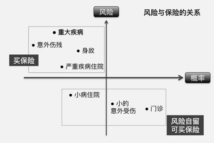 如果我們將日常生活中面臨的風險分為:重大風險和中低風險。然后,不同的風險,對我們造成的影響,需要通過保險轉移的風險以及可以支付的成本可能會有很大差異。