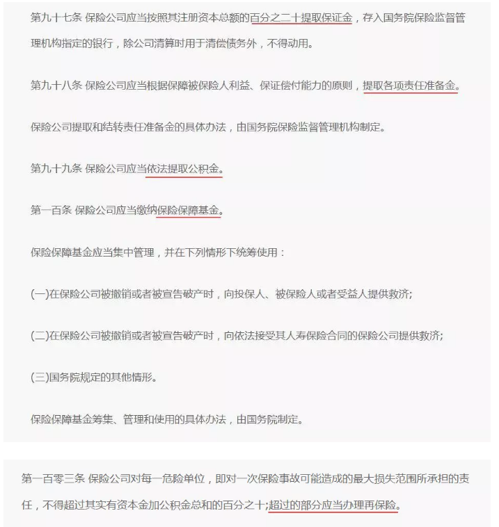 《保險(xiǎn)法》第97,98,99,100和103條對應(yīng)于:保證金制度,責(zé)任準(zhǔn)備金制度,公積金制度,保險(xiǎn)保障基金制度和再保險(xiǎn)制度,其中每一個(gè)都是有保險(xiǎn)。該公司的安全性提供了可靠的保障。