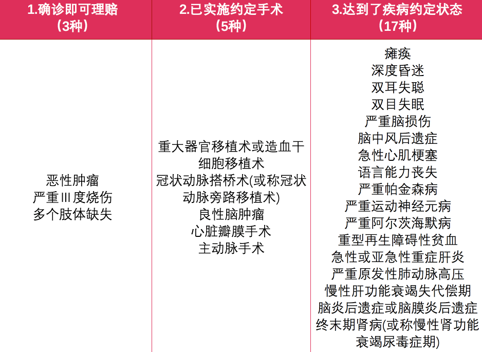 疾病的賠付大致分為3類:確診就可以理賠,已經(jīng)實施了約定的手術,并且達到了疾病約定狀態(tài)。