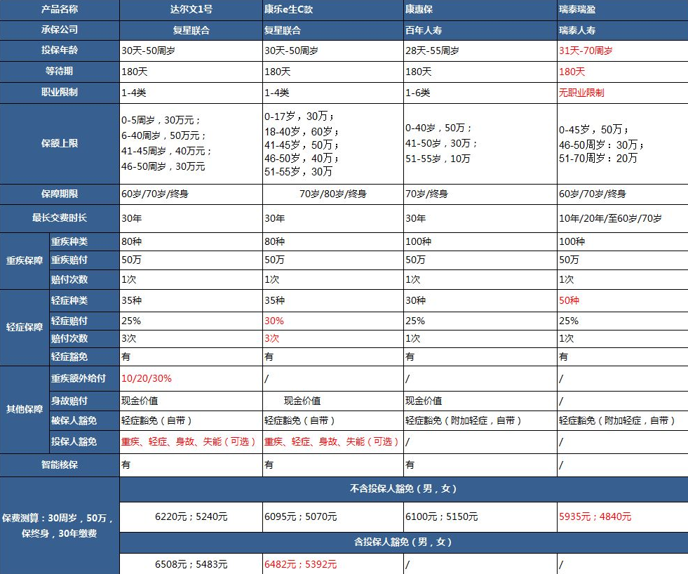 為了便于比較,多保魚把達(dá)爾文1號、百年康惠保、 瑞泰瑞盈和復(fù)星聯(lián)合康樂e生中進(jìn)行了比較: