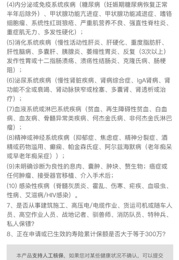 不同的是,兩個(gè)低費(fèi)率版本的擎天柱2018plus需要提供醫(yī)療報(bào)告或離線(xiàn)體檢,這無(wú)形地增加了保險(xiǎn)的門(mén)檻。而擎天柱2號(hào)“健康優(yōu)選版”,多保魚(yú)確認(rèn),只需要符合健康告知,即可直接投保。當(dāng)然,首選版本健康告知比標(biāo)準(zhǔn)版本嚴(yán)格得多: