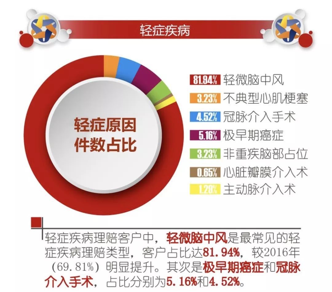 通過數(shù)據可以看出:輕微腦中風,極早期惡性腫瘤,冠狀動脈介入手術排在理賠前三位。