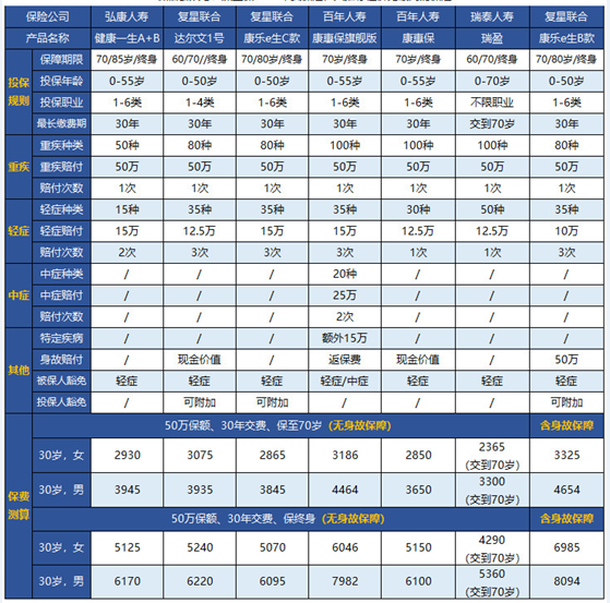 下圖是幾個我認為還不錯的重疾險產品的橫向測評: